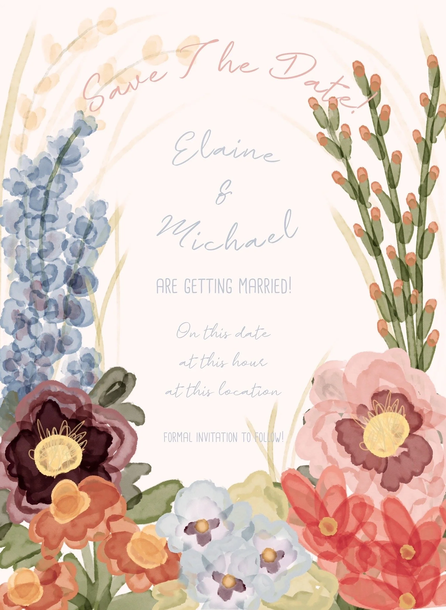 I wanted these Save The Dates to feel elegant yet playful, incorporating florals of various visual textures and a warm-washed backdrop to gently elevate the vibrance. The right image depicts a digital mock-up, and the left shows the final, hand painted watercolor product.